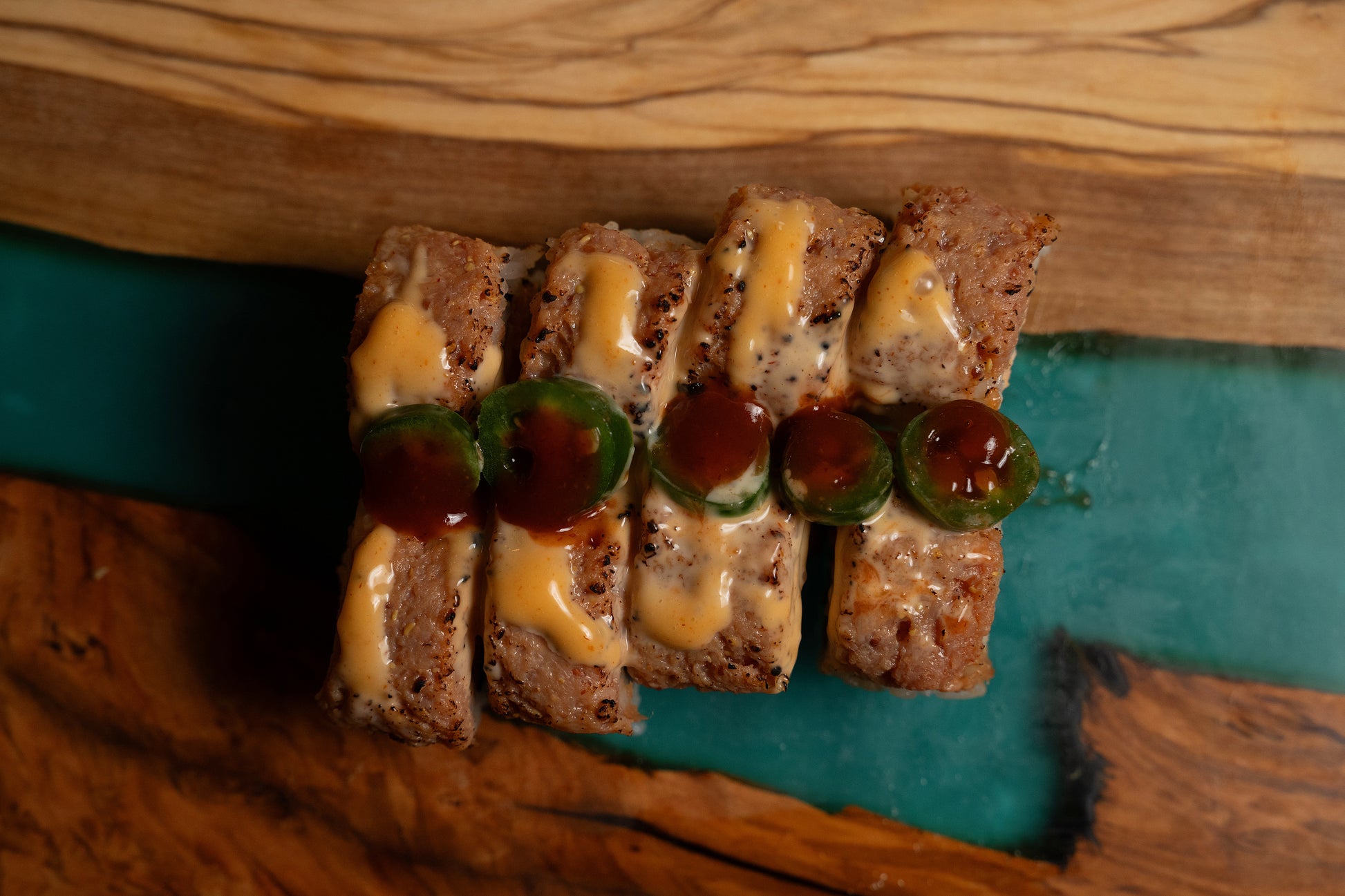 Baked salmon, kani, topped with seared spicy tuna, jalapeno and spicy mayo. A colorful and flavorful special roll.