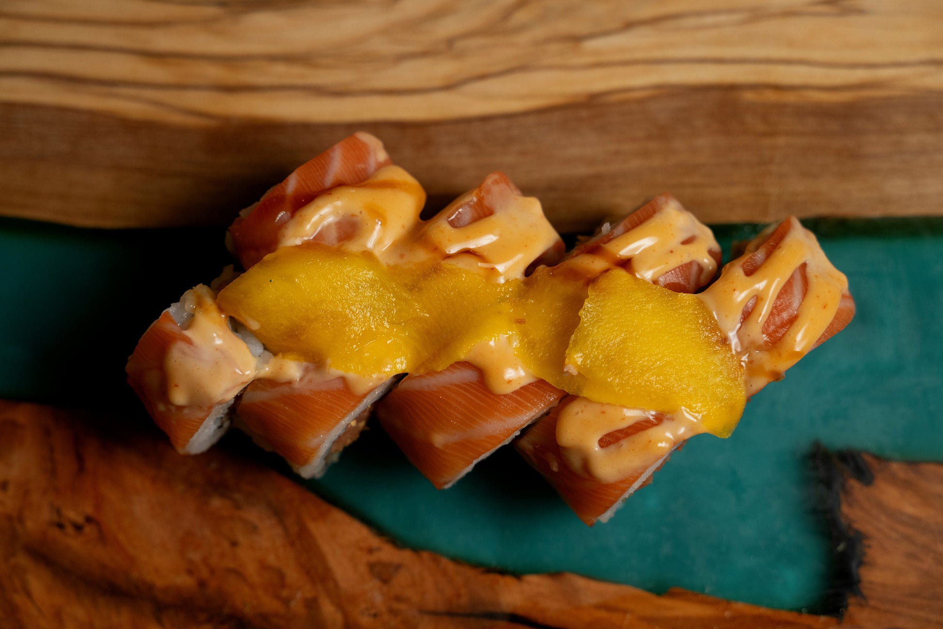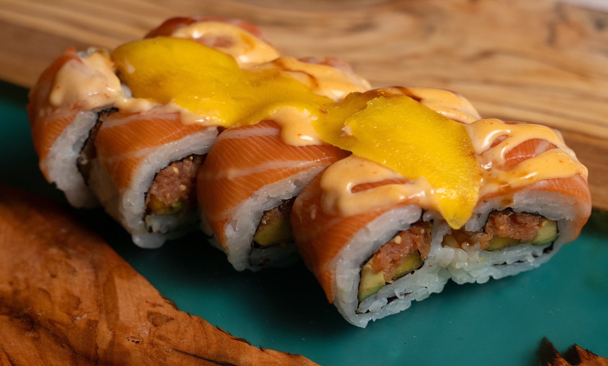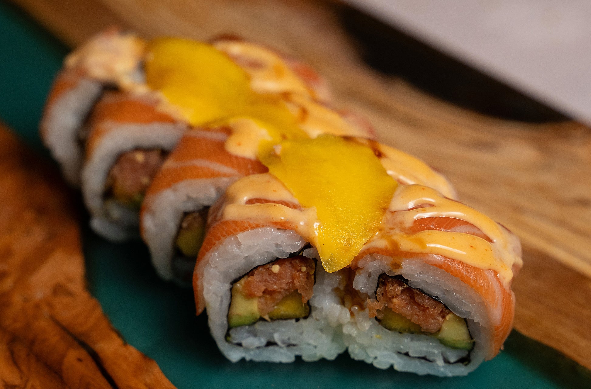 Spicy tuna, mango, avocado, topped with salmon. A perfect balance of sweet and spicy.
