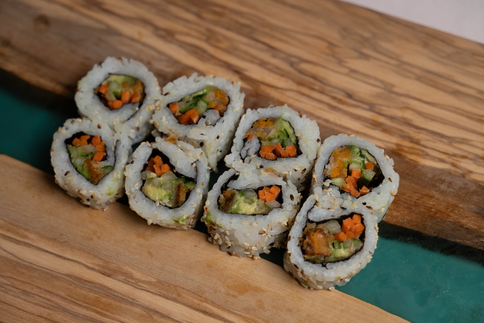 Sweet potato, cucumber, avocado, and carrot wrapped in seasoned rice and seaweed.
